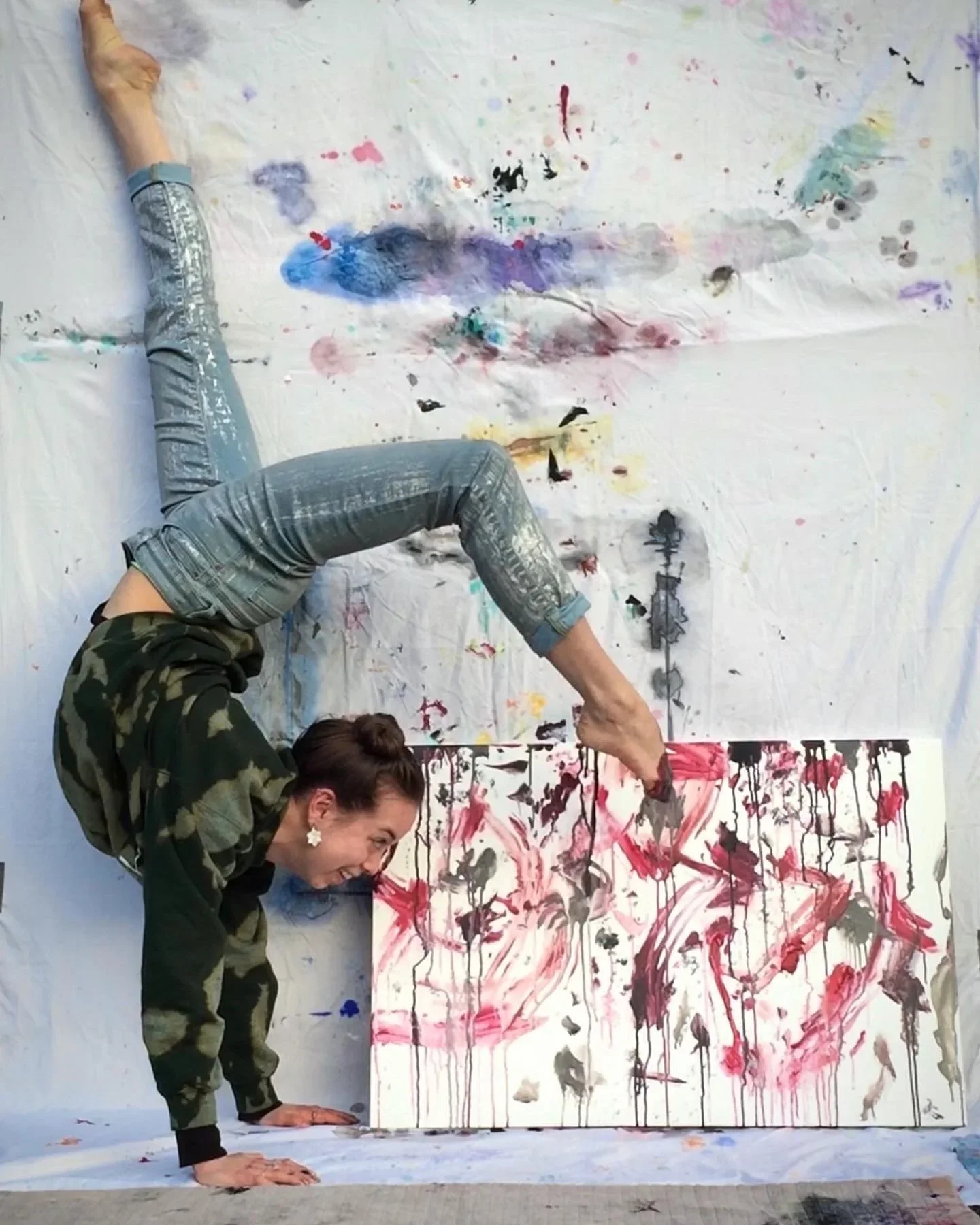 B: Favorite supplies are acrylic paint, stretched canvases, oil paint, variety of brushes, sea sponges, rubber bands, hawk feathers 🪶 (that I have found on trail walks) and alcohol and water sprayers. Favorite tools are my feet, hands, (sometimes my nose 😂) oh and my bow & arrow.